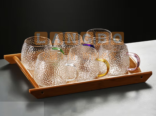茶水杯托盘套装 6只水杯 六色杯+双把竹托盘 玻璃杯水杯 耐热带把一人一杯茶杯
