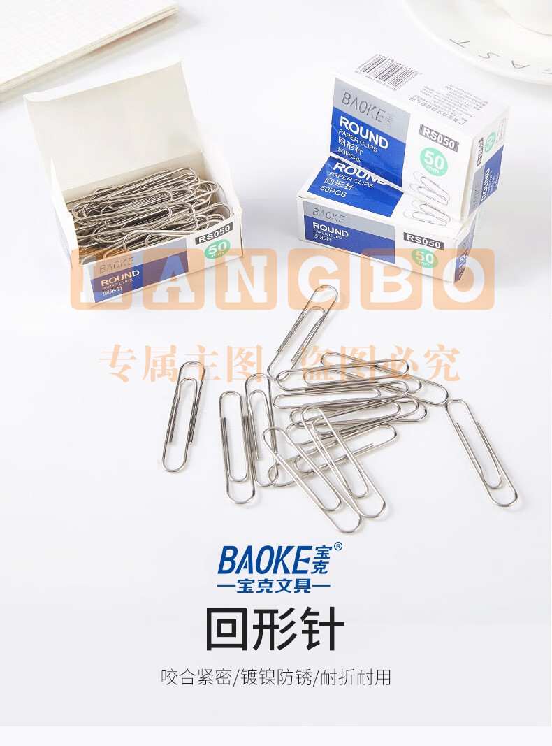 宝克(BAOKE) 金属回形针 镀镍防锈 曲别针 办公用品 多功能文件整理试卷归类 文具 银色 银色 29mm 10盒 RS029
