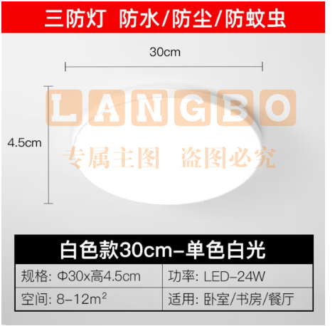 箭牌(ARROW)吸顶灯led三防卧室灯薄圆形防水卫生间阳台厨卫过道灯 白色款/三防灯40cm【白光/24W】