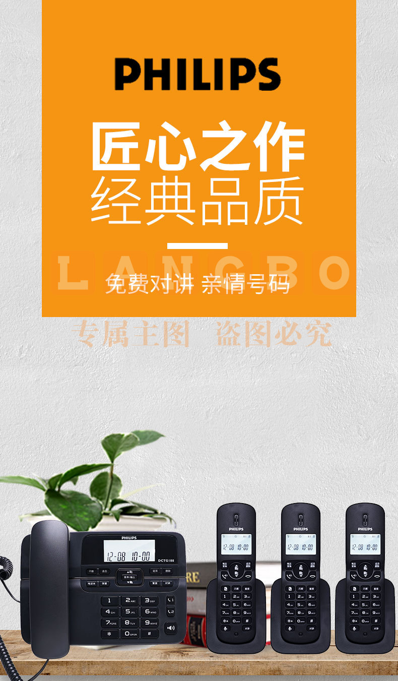 飞利浦DCTG188数字无绳电话机办公家用座机电话子母机免提通话/一键拨号/DCTG188一拖一(黑色)