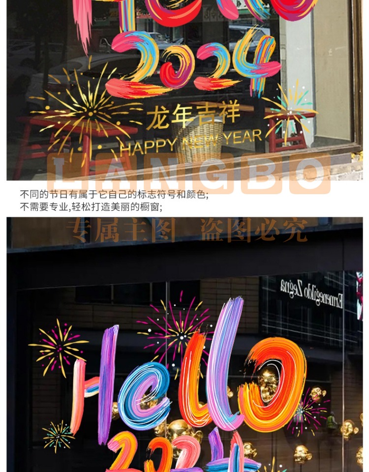 新年装饰品大型橱窗场景布置2024龙年春节静电窗花过年玻璃门贴纸 超大号 款式:2024XN-5-1/2024XN-5-2