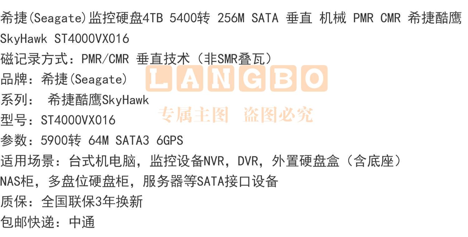 希捷ST4000VX015国行彩盒 酷鹰4TB桌上型电脑械监控硬盘